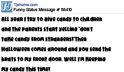 X says All year I try to give candy to children and the parents start yelling "don't take candy from strangers!"Then Halloween comes around and you send the brats to my front door. Well I'm keeping my candy this time!