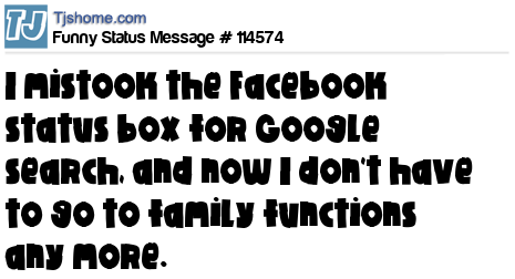 - # 149311 I mistook the Facebook status box for Google search, and now I don’t have to go to family functions any more.