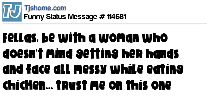 X is Fellas, be with a woman who doesn't mind getting her hands and face all messy while eating chicken... trust me on this one