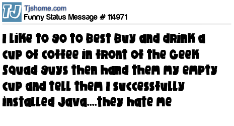 X I like to go to Best Buy and drink a cup of coffee in front of the Geek Squad guys then hand them my empty cup and tell them I successfully installed Java....they hate me