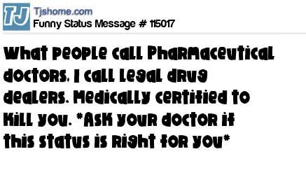 X What people call Pharmaceutical doctors, I call legal drug dealers. Medically certified to kill you. *Ask your doctor if this status is right for you*