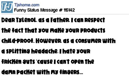 X Dear Tylenol, as a Father, I can respect the fact that you make your products child-proof. However, as a consumer with a splitting headache, I hate your fricken guts 'cause I can't open the damn packet with my fingers...