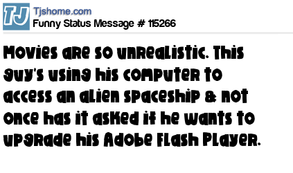 X  Movies are so unrealistic. This guy's using his computer to access an alien spaceship & not once has it asked if he wants to upgrade his Adobe Flash Player.
