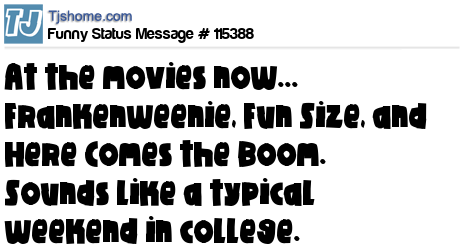 X At the movies now... Frankenweenie, Fun Size, and Here Comes the Boom. Sounds like a typical weekend in college.