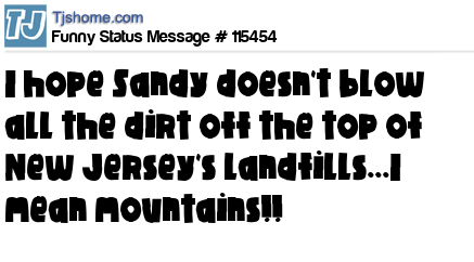 X says I hope Sandy doesn't blow all the dirt off the top of New Jersey's landfills...I mean mountains!!