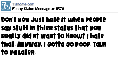 - # 92660 Don't you just hate it when people say stuff in their status that you really didn't want to know? I hate that.. Anyway, I'll cut this short cause,, I gotta go poop.
