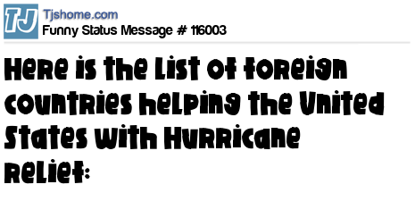 - # 115745 Below is the list of foreign countries helping the United States with Hurricane relief: Click >HERE< to continue to next page. (Funny how we are ALWAYS there for everyone else.)