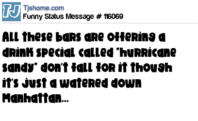 - # 115810 I heard there's a new drink bartenders are making, it's called a "Hurricane Sandy", essentially it's just a watered down Manhattan. (too soon?)