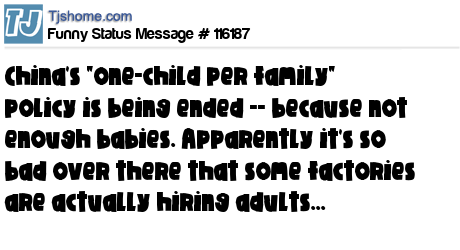 X is China's "one-child per family" policy is being ended -- because not enough babies. Apparently it's so bad over there that some factories are actually hiring adults...