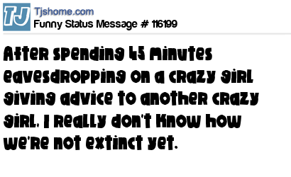 X says After spending 45 minutes eavesdropping on a crazy girl giving advice to another crazy girl, I really don't know how we're not extinct yet.