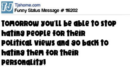 - # 172373 Glad the election is ending so people will stop hating me based on my political views and just go back to hating me based on my personality.