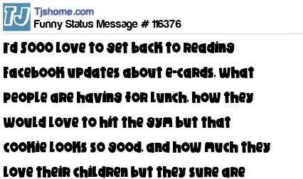 X says I'd SOOO love to get back to reading Facebook updates about e-cards, what people are having for lunch, how they would love to hit the gym but that cookie looks so good, and how much they love their children but they sure are getting on mommy's nerves.