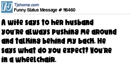 - # 83317 A wife says to her husband you're always pushing me around and talking behind my back. He says what do you expect? You're in a wheel chair.