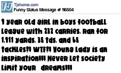 X  9 year old girl in boys football league with 232 carries, ran for 1,911 yards, 35 tds, and 65 tackles?! WTF?! Young lady is an inspiration!!! Never let society limit your dreams!!!