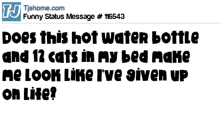 X says Does this hot water bottle and 12 cats in my bed make me look like I've given up on life?