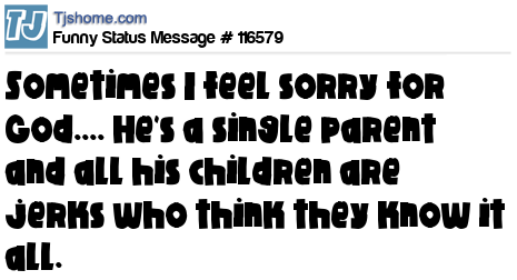 X Sometimes I feel sorry for God.... He's a single parent and all his children are jerks who think they know it all.