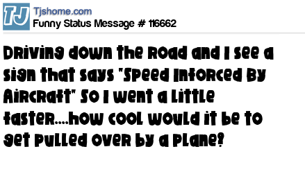 X Driving down the road and I see a sign that says "Speed Inforced By Aircraft" So I went a little faster....how cool would it be to get pulled over by a plane?