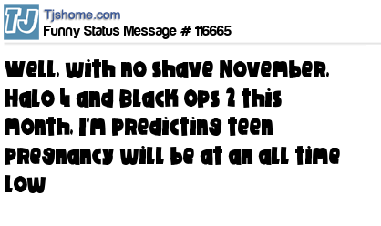 X is Well, with no shave November, Halo 4 and Black Ops 2 this month, I'm predicting teen pregnancy will be at an all time low