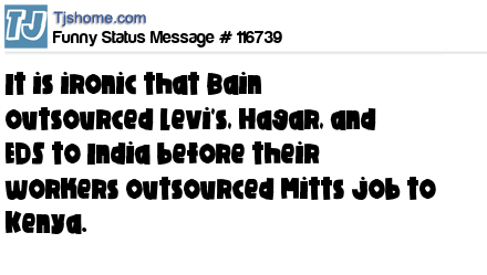 X is It is ironic that Bain outsourced Levi's, Hagar, and EDS to India before their workers outsourced Mitts job to Kenya.