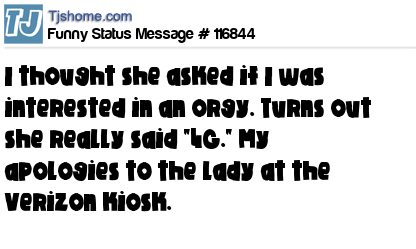 - # 181668 I thought she asked if I was interested in an orgy... Turns out she really said "4G." My apologies to the lady at the Verizon kiosk.