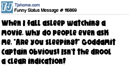 X says When I fall asleep watching a movie, why do people even ask me, "Are you sleeping?" Goddamit Captain Obvious! Isn't the drool a clear indication?