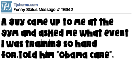 X is A guy came up to me at the gym and asked me what event I was training so hard for.Told him "Obama care".