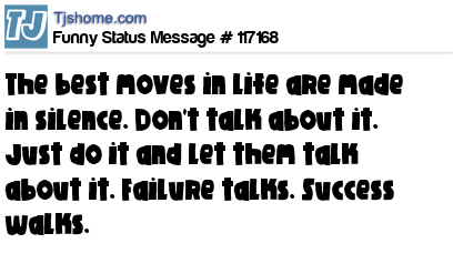X The best moves in life are made in silence. Don't talk about it. Just do it and let them talk about it. Failure talks. Success walks.