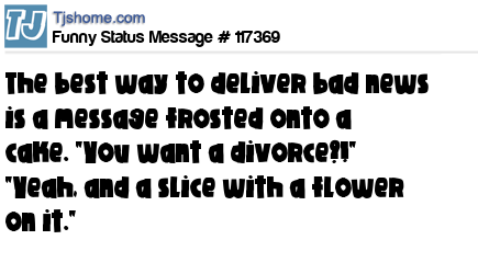 X The best way to deliver bad news is a message frosted onto a cake. "You want a divorce?!" "Yeah, and a slice with a flower on it."