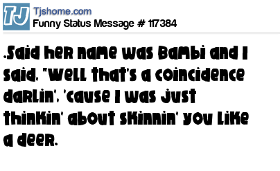 X is .Said her name was Bambi and I said, "Well that's a coincidence darlin', 'cause I was just thinkin' about skinnin' you like a deer.