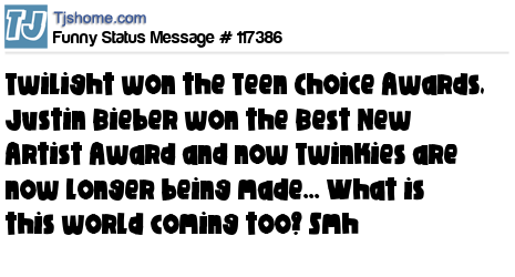 X is Twilight won the Teen Choice Awards, Justin Bieber won the Best New Artist Award and now Twinkies are now longer being made... What is this world coming too? Smh