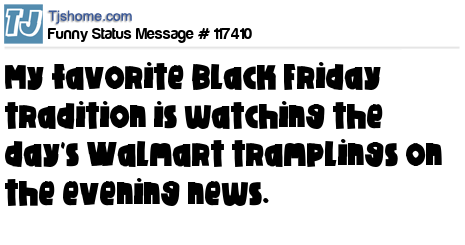 - # 140285 I am really looking forward to my favorite Thanksgiving tradition. Watching the "Black Friday" shoppers at Walmart trampling each other on the evening news.