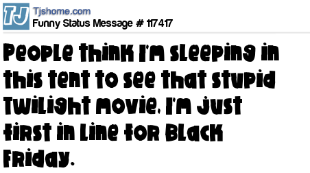 X People think I'm sleeping in this tent to see that stupid Twilight movie, I'm just first in line for Black Friday.