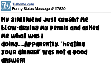- # 91887 My girlfriend just caught me blow drying my pen!s and asked me what was I doing...apparently "heating your dinner" wasn't the right answer.