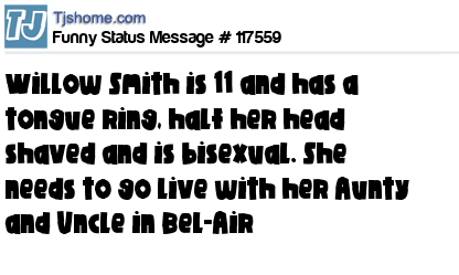 - # 107589 Willow Smith is 11 years old and has a tongue piercing, half of her hair shaved off, and is claiming to be bisexual? Sounds like somebody needs to move in with their auntie and uncle in Bel-Air.
