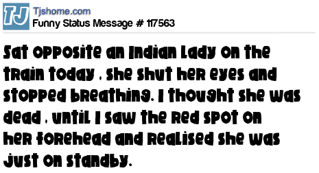 X  Sat opposite an Indian lady on the train today , she shut her eyes and stopped breathing. I thought she was dead , until I saw the red spot on her forehead and realised she was just on standby.