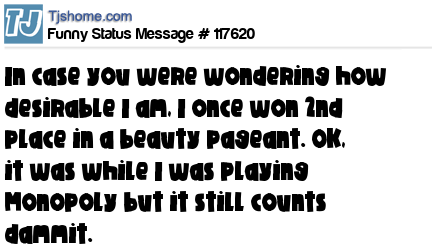 X In case you were wondering how desirable I am, I once won 2nd place in a beauty pageant. OK, it was while I was playing Monopoly but it still counts dammit.