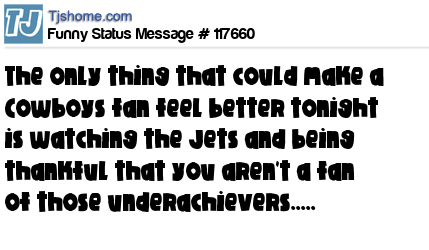 X is The only thing that could make a Cowboys fan feel better tonight is watching the Jets and being thankful that you aren't a fan of those underachievers.....