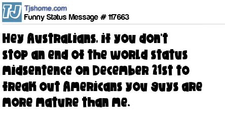 X Hey Australians, if you don't stop an end of the world status midsentence on December 21st to freak out Americans you guys are more mature than me.