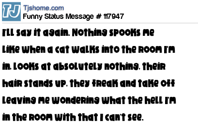 X I'll say it again. Nothing spooks me like when a cat walks into the room I'm in, looks at absolutely nothing, their hair stands up, they freak and take off leaving me wondering what the hell I'm in the room with that I can't see.