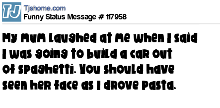 - # 131071 My wife bet me that I couldn't make a car out of spaghetti. You should have seen her expression when I drove pasta!