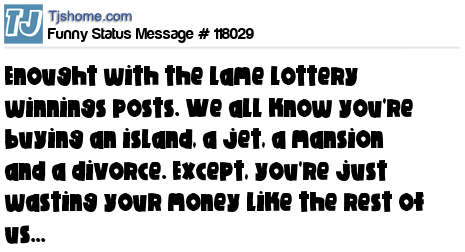 X says enought with the lame lottery winnings posts. We all know you're buying an island, a jet, a mansion and a divorce. Except, you're just wasting your money like the rest of us...