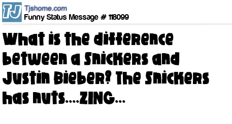 X What is the difference between a Snickers and Justin Bieber? The Snickers has nuts....ZING...
