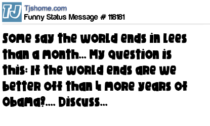 X is Some say the world ends in lees than a month... My question is this: If the world ends are we better off than 4 more years of Obama?.... Discuss...