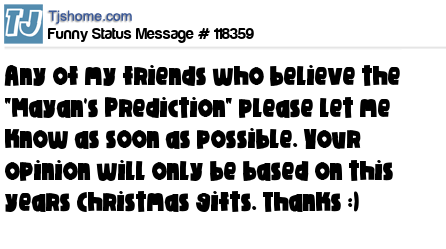 X Any of my friends who believe the "Mayan's Prediction" please let me know as soon as possible. Your opinion will only be based on this years Christmas gifts. Thanks :)