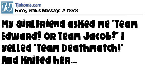 X is My girlfriend asked me "Team Edward? Or Team Jacob?" I yelled "Team Deathmatch!" And knifed her...