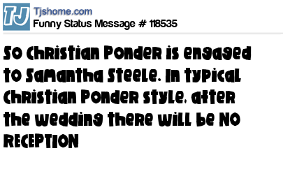 X is So Christian Ponder is engaged to Samantha Steele. In typical Christian Ponder style, after the wedding there will be NO RECEPTION