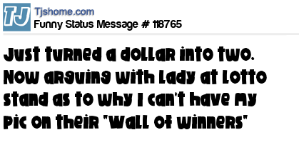 X says Just turned a dollar into two. Now arguing with lady at lotto stand as to why I can't have my pic on their "Wall of winners"