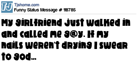 X says My girlfriend just walked in and called me g@y. If my nails weren't drying I swear to god…