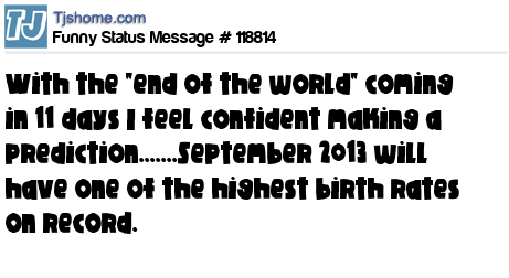 X  With the "end of the world" coming in 11 days I feel confident making a prediction.......September 2013 will have one of the highest birth rates on record.
