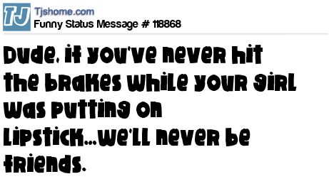 X says Dude, if you've never hit the brakes while your girl was putting on lipstick…we'll never be friends.